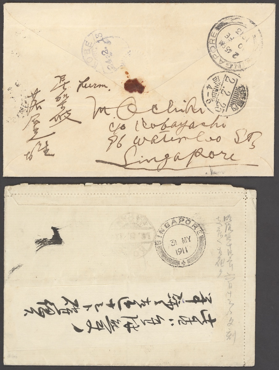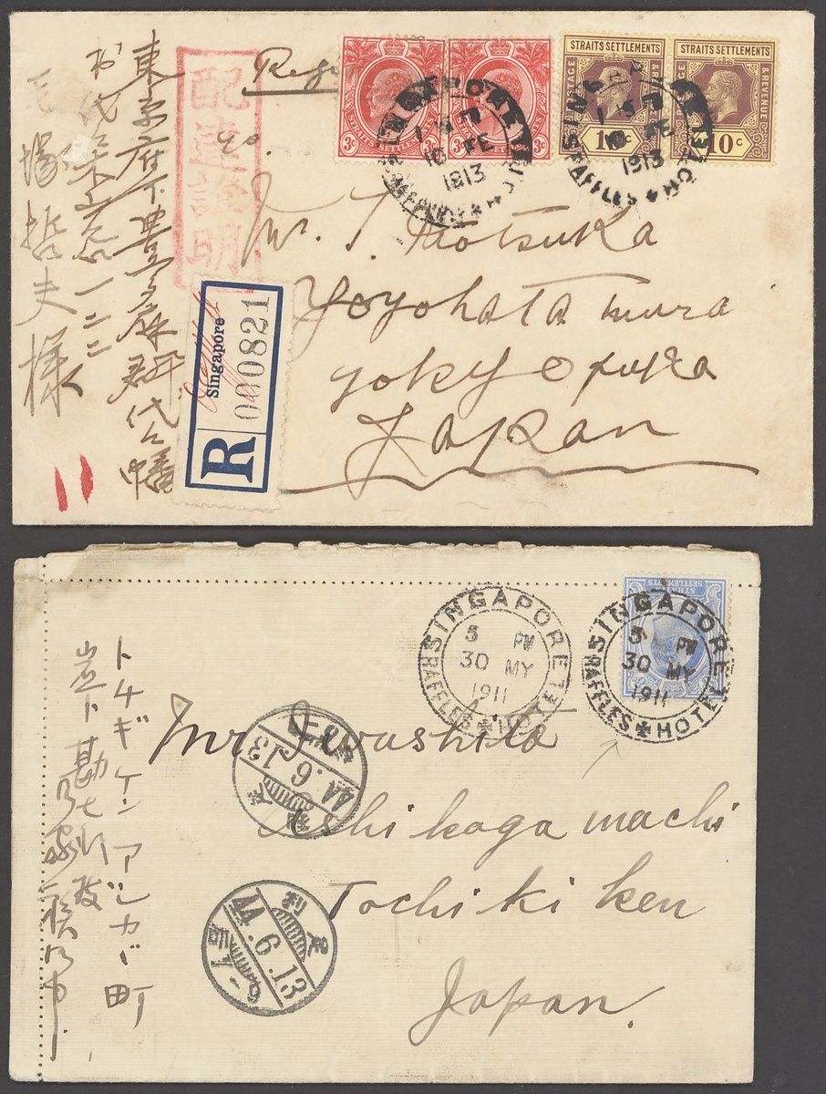1911 (30 May) and 1913 (10 Feb.) envelopes to Japan, the former franked at 8c. and the latter registered and franked at 26c., all tied by