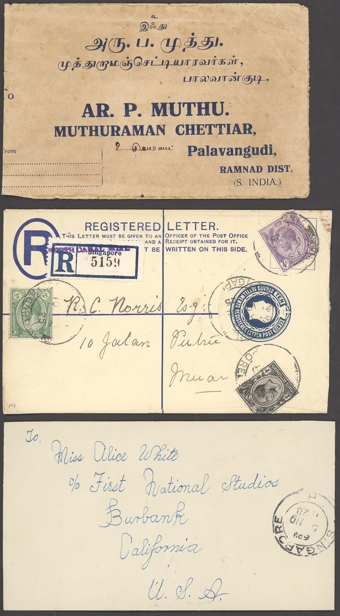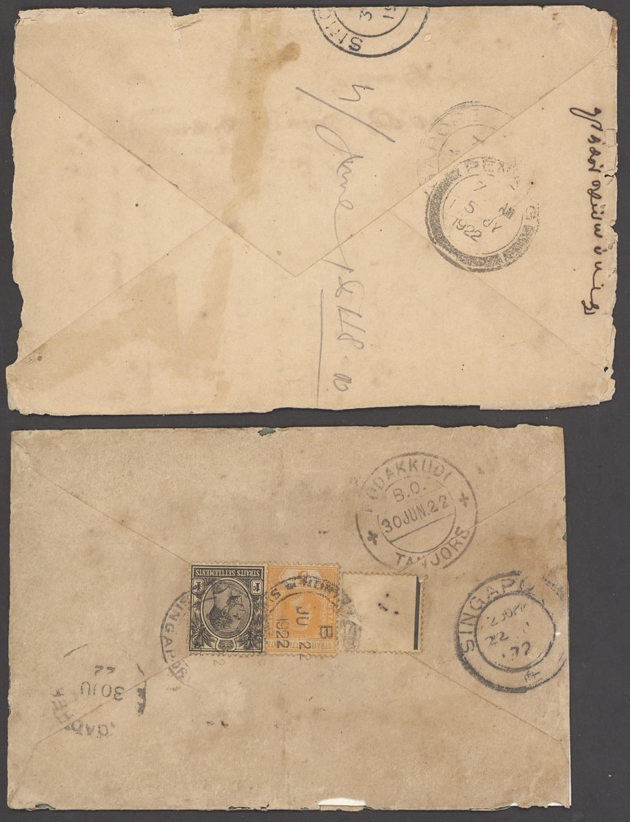 1922 (22 June) and (3 July) envelopes (faults) to India and Penang franked at 6c. and cancelled by