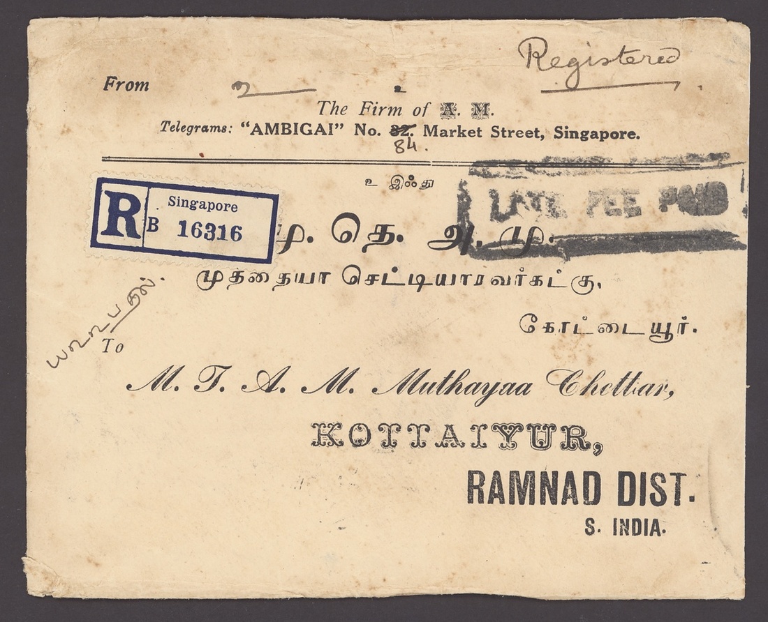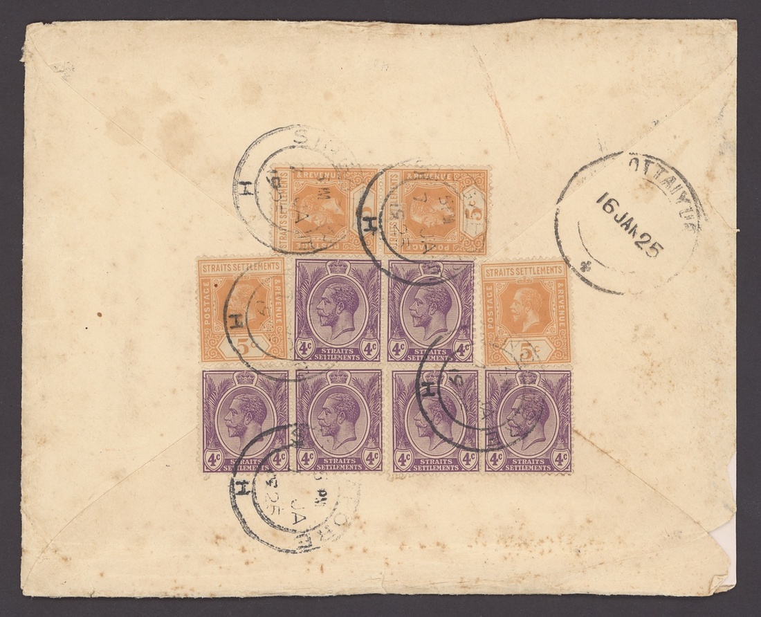 1925 (7 Jan.) envelope registered from Singapore to India bearing, on reverse, 4c. (6) and 5c. (4) tied by