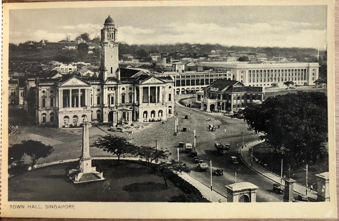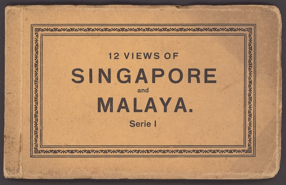 "12 Views of Singapore and Malaya, Serie I" booklet with black on buff cover, pictures include Ubad Aiah Mosque Kuala Kangsar, Collyer Quay (detached and rejoined with adhesive tape), Boat Quay, Town Hall and Jinriksha Station; covers soiled and the cards with some minor foxing in places