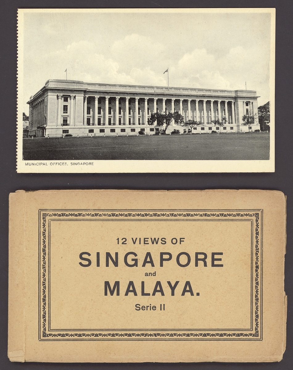 "12 Views of Singapore and Malaya, Serie II" booklet by unknown publisher, complete, pictures include Municipal Offices, General Post Office, Alkaff Gardens, St. Joseph Institution, Government Garden and Singapore River; cover a little soiled and with tear at foot of fold