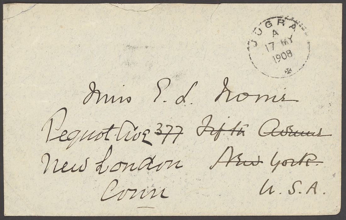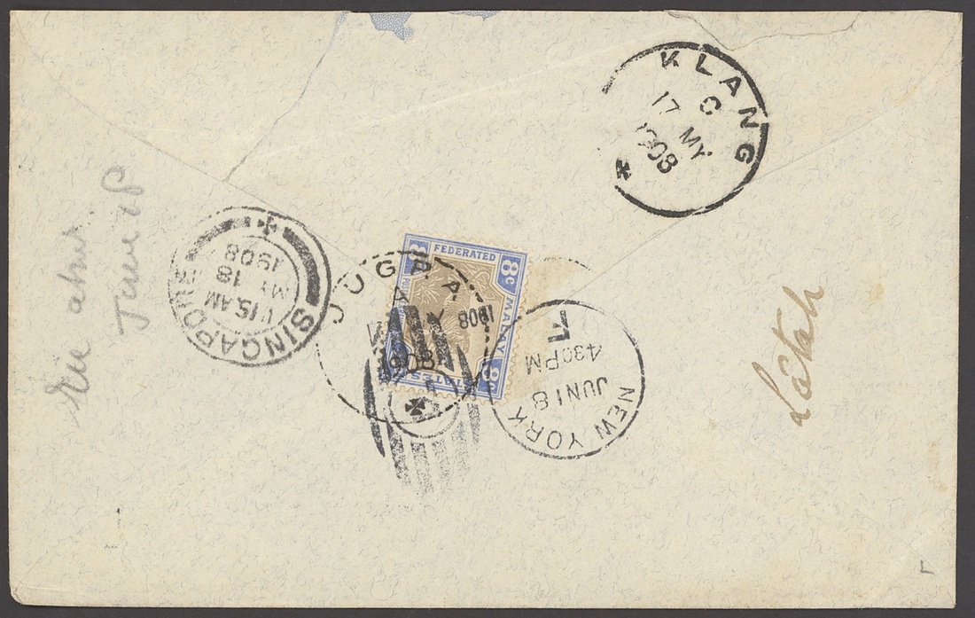 1908 (17 May) envelope to USA, redirected internally, bearing on reverse, FMS 8c. tied by