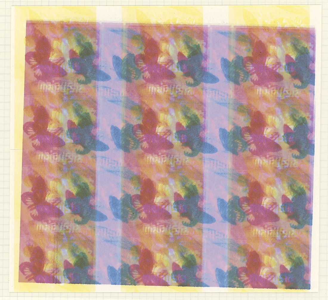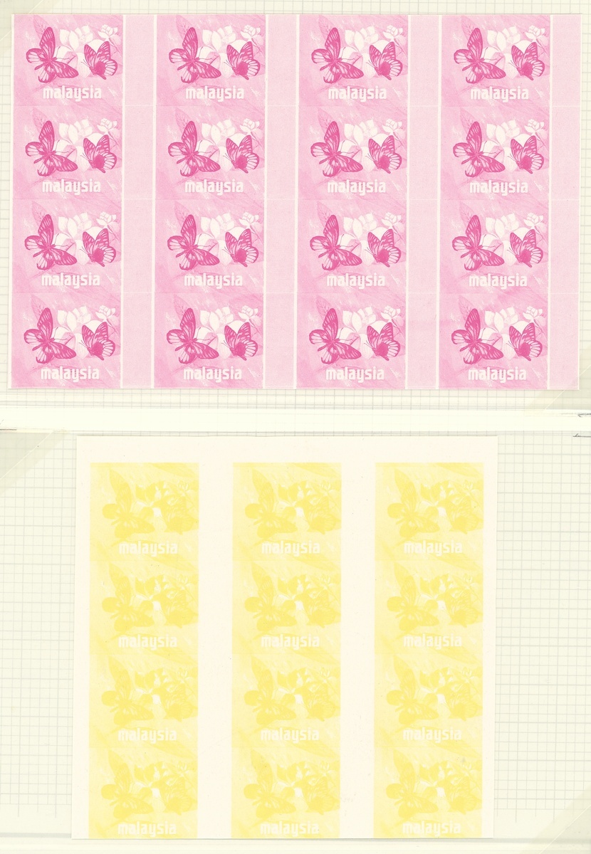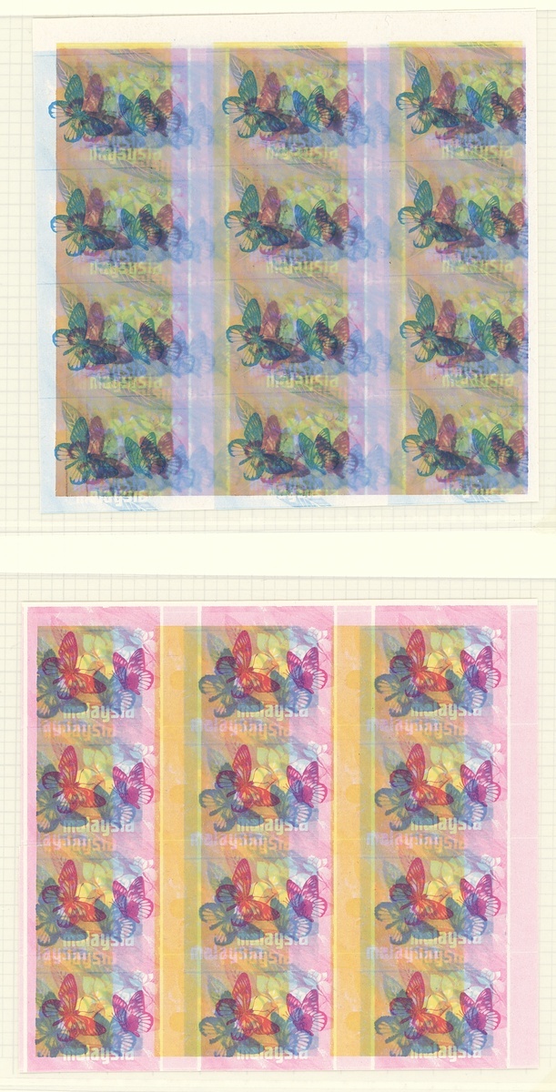 1c. imperforate colour separation proofs comprising cyan block of twelve (3x4), magenta block of sixteen (4x4), yellow block of twelve (3x4), cyan and black block of twelve (3x4), and three blocks of twelve (3x4) of various colour combinations, all misplaced. A fine lot
