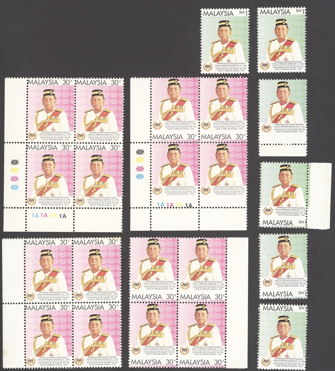 1994 (Sept.) Sultan Tuanku Ja'afar 30c. lower left corner block of four with plate numbers showing dramatic shift of horizontal perfs downwards resulting in lower pair without