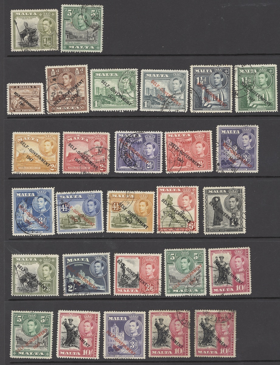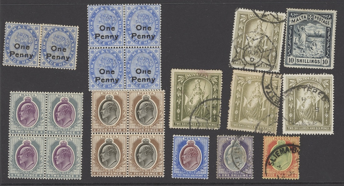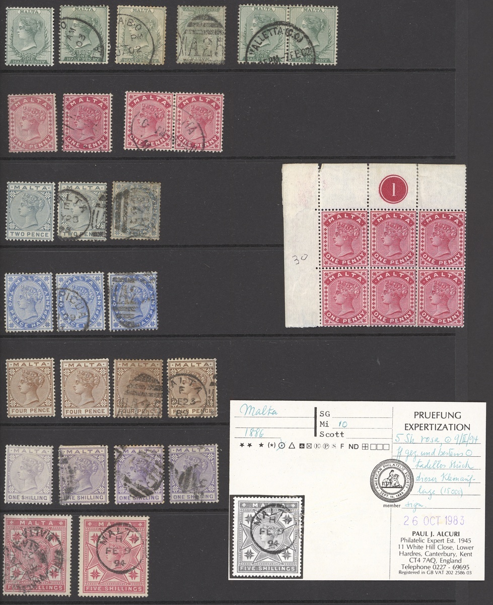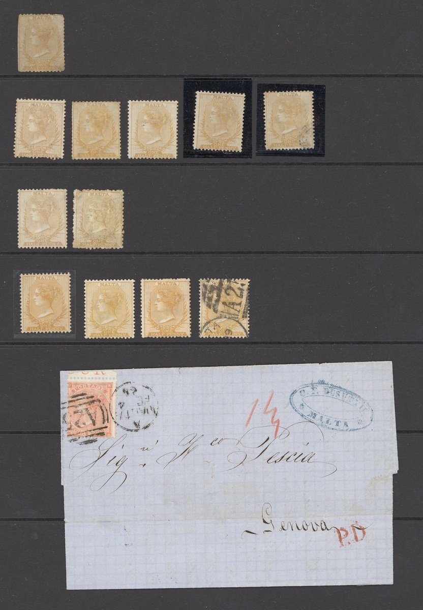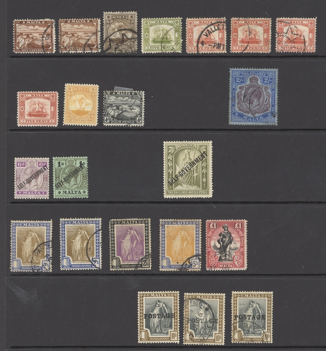 A selection on stockleaves which includes G.B. 1862-64 4d., HD tied by "A25" on wrapper to Genoa, a selection of 1863-81 ½d. unused (6) and used, 1882-84 ½d. unused (3) and used, 1885-90 values to 1/- unused and used (3), 1886 5/- used (2), 1899-1901 10/- unused, 1914-21 2/- used, 1922 Self-Government 2/6d. unused, 1922-26 £1 fine used, 1926