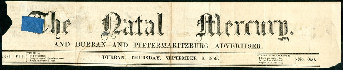 1859 (8 Sept.) masthead of "The Natal Mercury" bearing 1859 embossed 1d. blue tied by c.d.s. cancellation; the adhesive with small tear on one side and newspaper masthead with some filing folds and faults as to be expected with an item of this nature, though a very rare survivor newspaper usage from this Colony. A.P.S. Certificate (2016). S.G. 1