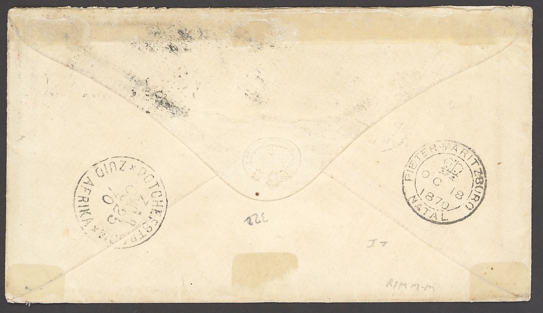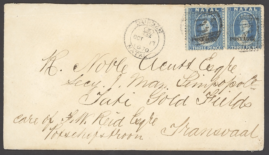 1870 (Oct.) envelope from Durban to the Tati Gold Fields care of F.W. Reid at Potchefstroom, bearing 1869 "
