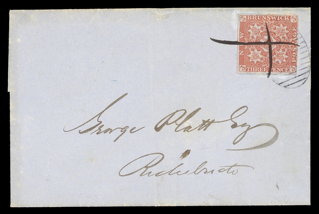 1851-60 3d. bright red with close to good margins tied by oval grid plus pen cancel on 1852 (29 Sept.) entire letter from Chatham to Richibucto showing, on reverse, despatch and arrival (29.9) datestamps. A fine and scarce cover. S.G. 1, £900.
