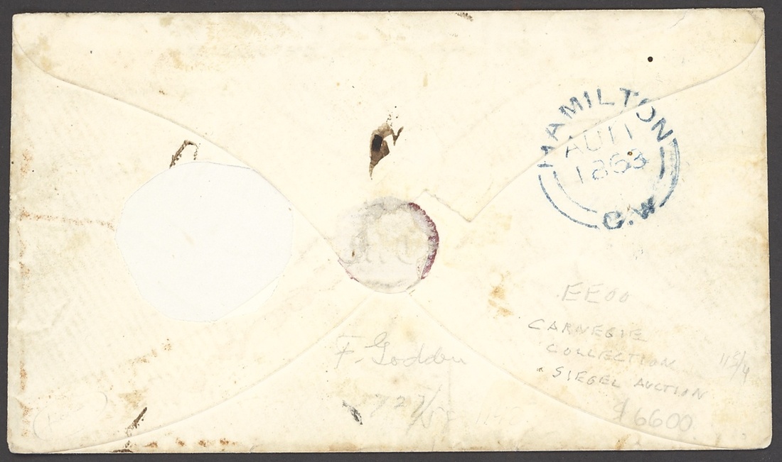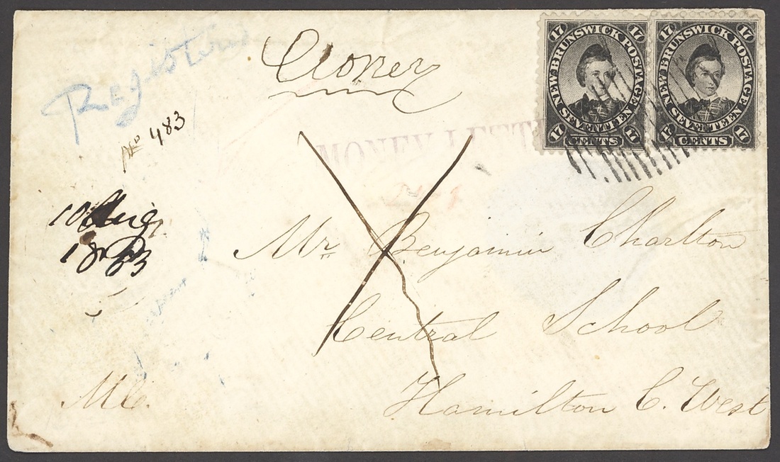 1866 (Aug.) envelope to Hamilton, Canada West, marked "Money" and "Registered", bearing 1860-63 17c. (2) tied by oval of bars and unframed