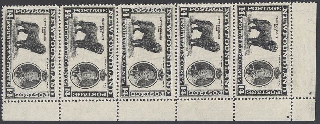 1937 Long Coronation 14c. black, a top right corner vertical strip of five showing the major re-entries on [10], [20], [30] and [50], excellent centring, fine unmounted mint. Unitrade 238/vi/vii/viii/ix, $332+. S.G. 262