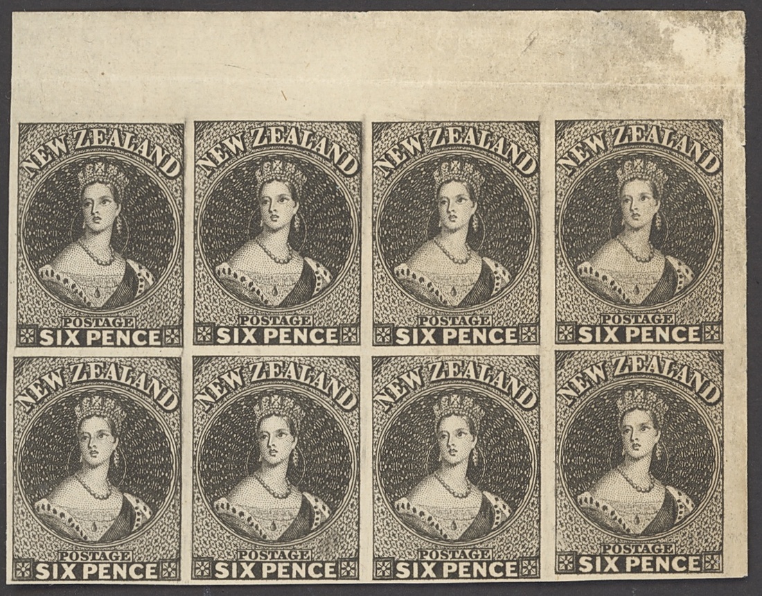 1855-57 6d. original plate proof in black on medium thick, wove unwatermarked paper, an upper right corner block of eight; trivial creasing in the margins and just touching one stamp; fine