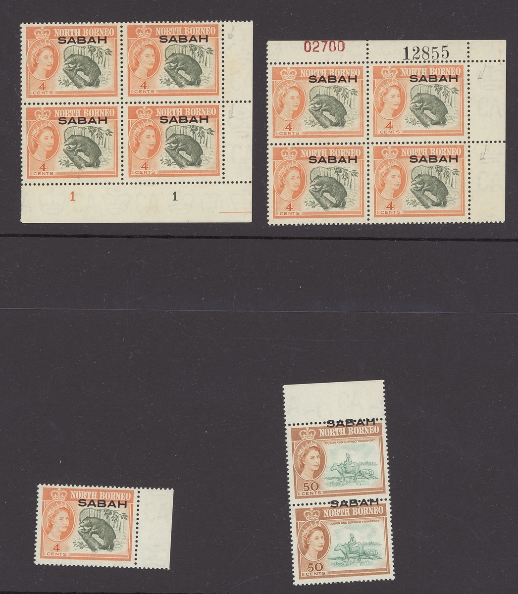 1961 4c. top right and bottom right corner blocks of four (both a fraction gum toned) and a single, each showing overprint misplaced downwards, and 50c. top marginal vertical pair with overprint misplaced upwards, unmounted mint