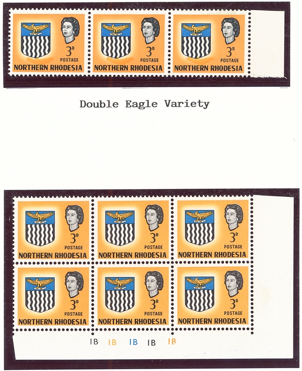 1963 Arms 3d. yellow marginal strip of three from the right of the sheet showing double impression of eagle at the foot of each stamp over