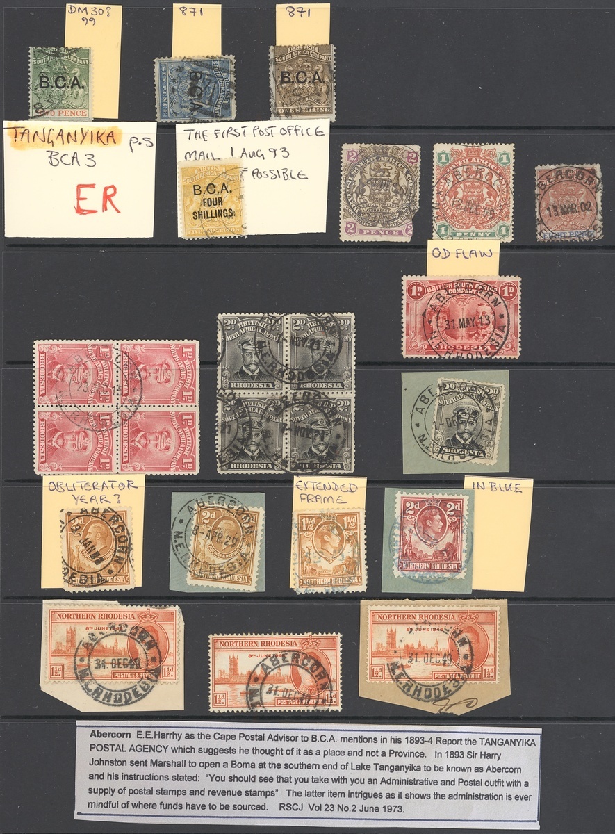 Abercorn A selection (18 items) including four B.C.A. values, 2d. with single-ring datestamp, 6d. and 1/- cancelled "871" and 4/- on 5/- with part Tanganyika double-ring datestamp, Abercorn double-ring datestamp on Arms values (3), Double Head 1d. with "