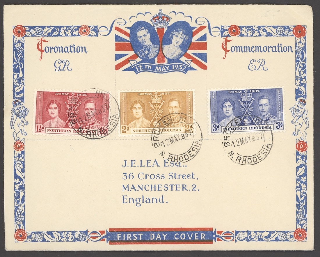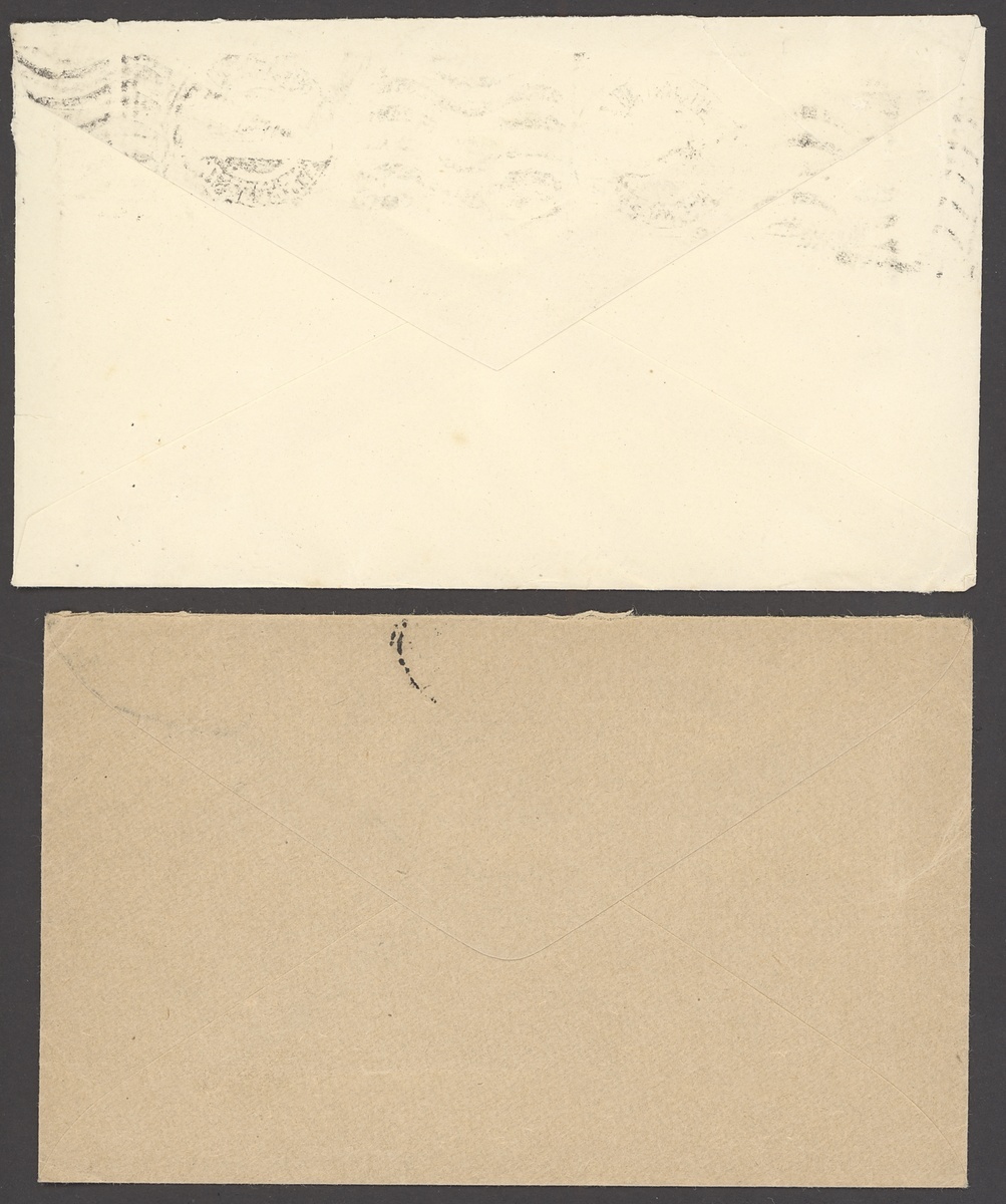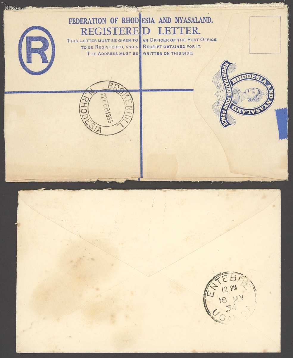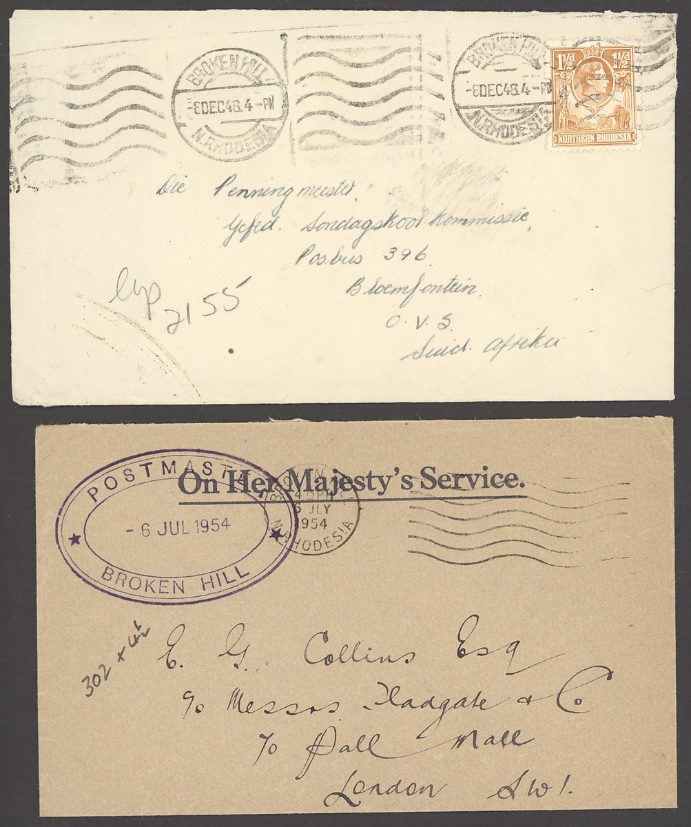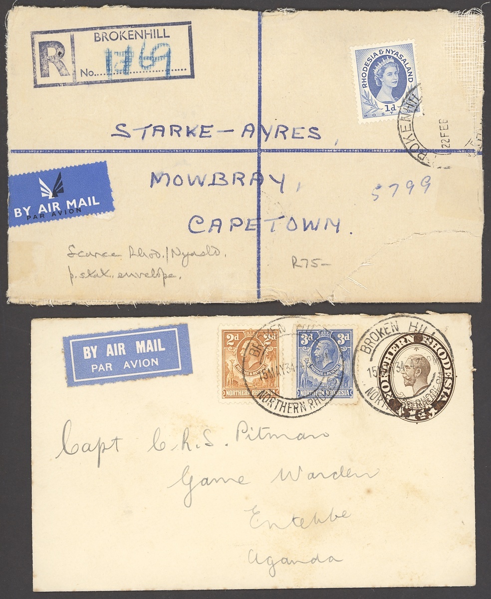 Broken Hill: 1934 1d. envelope, uprated with 2d. and 3d. with double-ring datestamps, to Uganda, 1937 Coronation illustrated first day cover to England, 1948 envelope to South Africa bearing 2d. with machine datestamp,  1954 Official envelope to London with Postmaster oval datestamp in violet and 1955 QE 4d. registered envelope, uprated with 1d. (another stamp removed) with registration handstamp in black