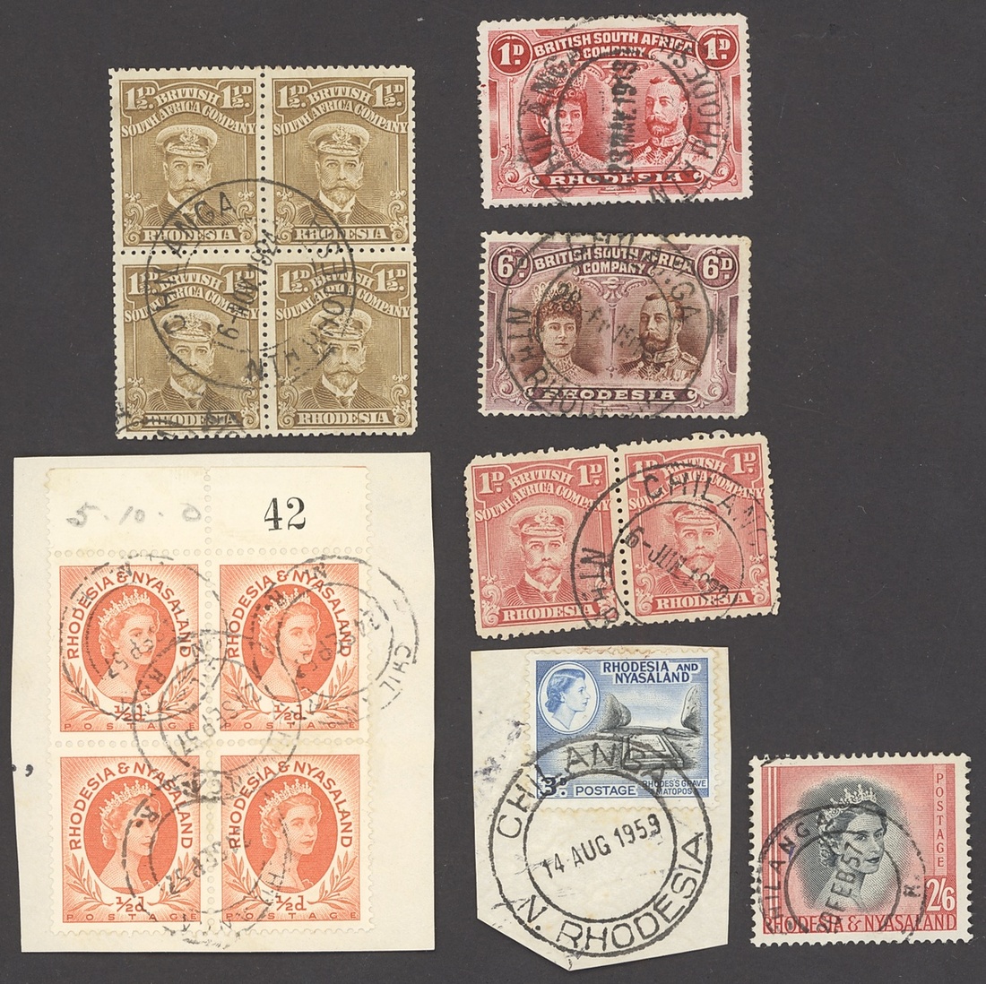 Chilanga: Double Head 1d. and 6d., Admiral 1d. pair and 1½d. block of four with 28mm. datestamps, R&N 1954 ½d. block of four and 2/6d. with 23mm. datestamps and 1959 3d. on piece with 30mm. datestamp