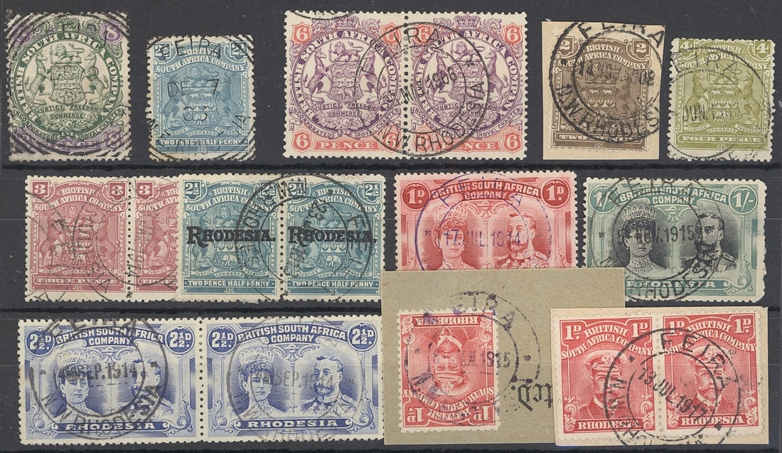 Feira: A selection with squared-circle on 1896-97 8d. and Small Arms 2½d., and double-ring datestamps on Small Arms 2d., 3d. pair, 4d., 1909-12 2½d. pair, Double Head 1d. (perf. 15), 2½d. pair, 1/- (faults) and Admiral 1d. pair and a single on two pieces, the Double Head 1d. and Admiral 1d. single struck in violet; generally fine strikes
