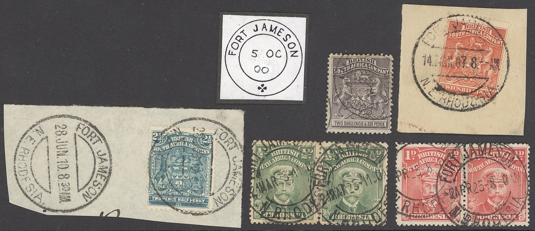 Fort Jameson: Double-ring datestamp with Maltese Cross at foot (Proud D4, has to be as no country name at foot) on 1893 2/6d. lilac dated 9 March 1900, a large part strike with only three examples apparently recorded, double-ring "bridge" type datestamp on 1892 2/- and Small Arms 2½d. on pieces, and double-ring datestamp on Admiral ½d. and 1d. pairs; generally fine strikes