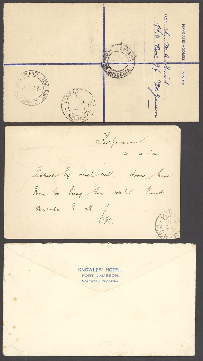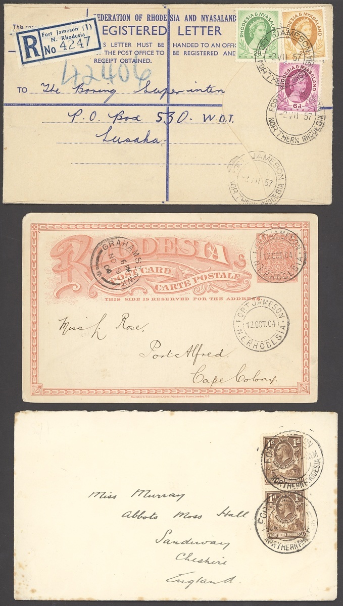 Fort Jameson: 1904 1d. red card to Cape Colony cancelled by double-ring datestamp and with Grahamstown c.d.s. at left, 1931 envelope (a few small fox marks) to England bearing N.R. 1d. pair with Proud D6 datestamps and 1957 registered envelope to Lusaka bearing 2d., 2½d. and 6d. with Proud D9 datestamps