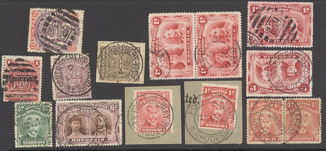 Fort Rosebery: A selection comprising "859" (3, one a 1d. Double Head), single-ring N.E. Rhodesia datestamp on Small Arms 2d. with "4" year date only, 6d. with code "O" sideways, Double Head pair and single (date inverted) and Admiral 1d. on piece, and double-ring datestamp on Double Head 6d. and Admiral ½d. 1d. on piece and a pair
