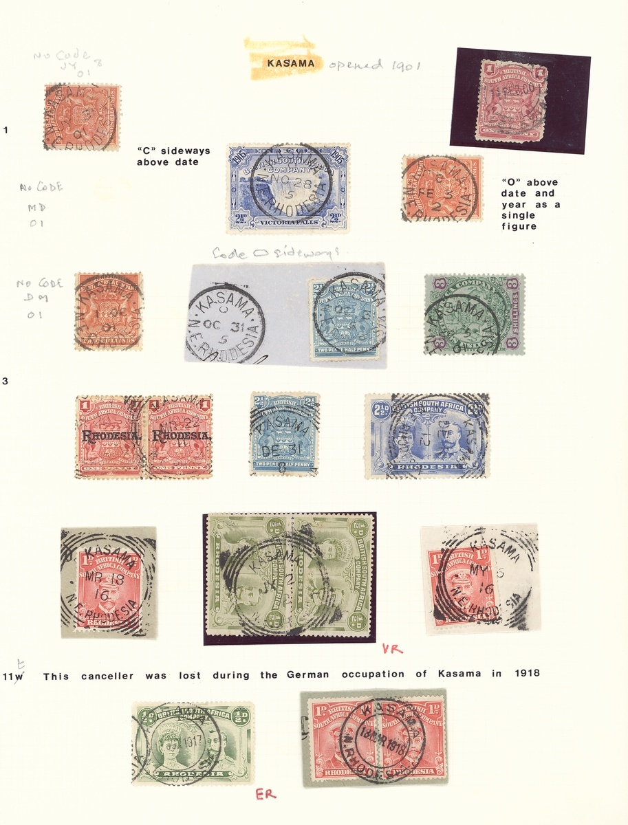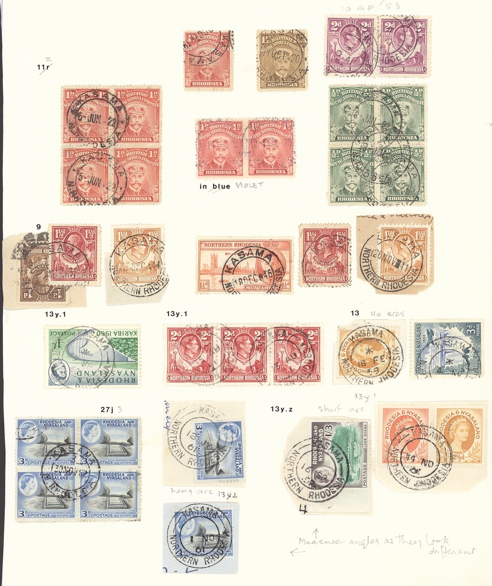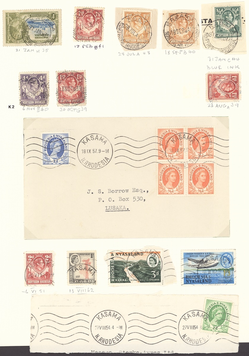 Kasama: 1901-62 selection (49 items) including single-ring datestamps (6 with two 1892 1/-, one without code), 1896 3/- and Falls 2½d.), squared-circles (6 with Double Head ½d. pair, 2½d. and two Admiral 1d.), small double-ring datestamps on Double Head ½d. and Admiral ½d. block of four, 1d. block of four, pairs (one cancelled in dull violet), single and 1½d., and a range of N.R. values with 1957 envelope to Lusaka; generally good to fine