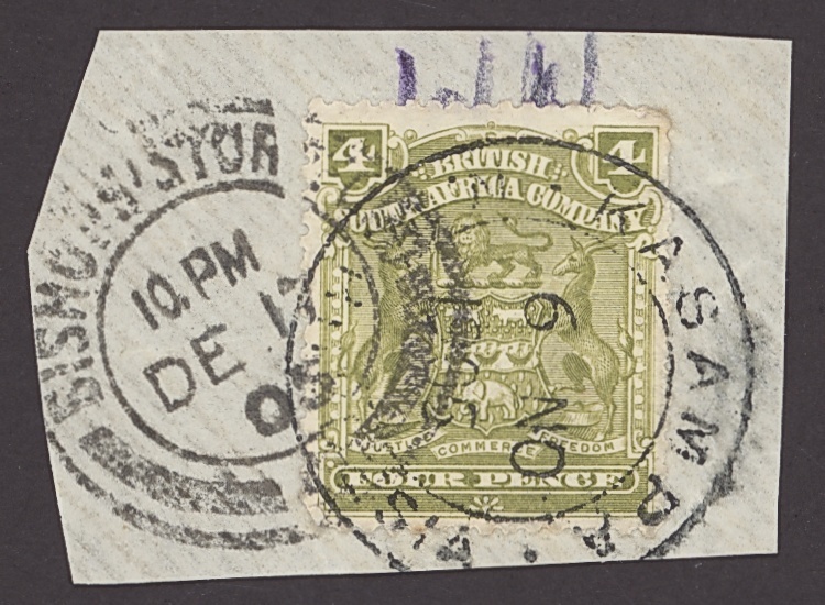 Kasampa: 1892 8d. and Small Arms 4d. with small part strikes of the double-ring datestamp, and Small Arms 4d. tied on piece by a complete strike for 6 November 1905 and partially over-cancelled by Bishops Stortford arrival datestamp