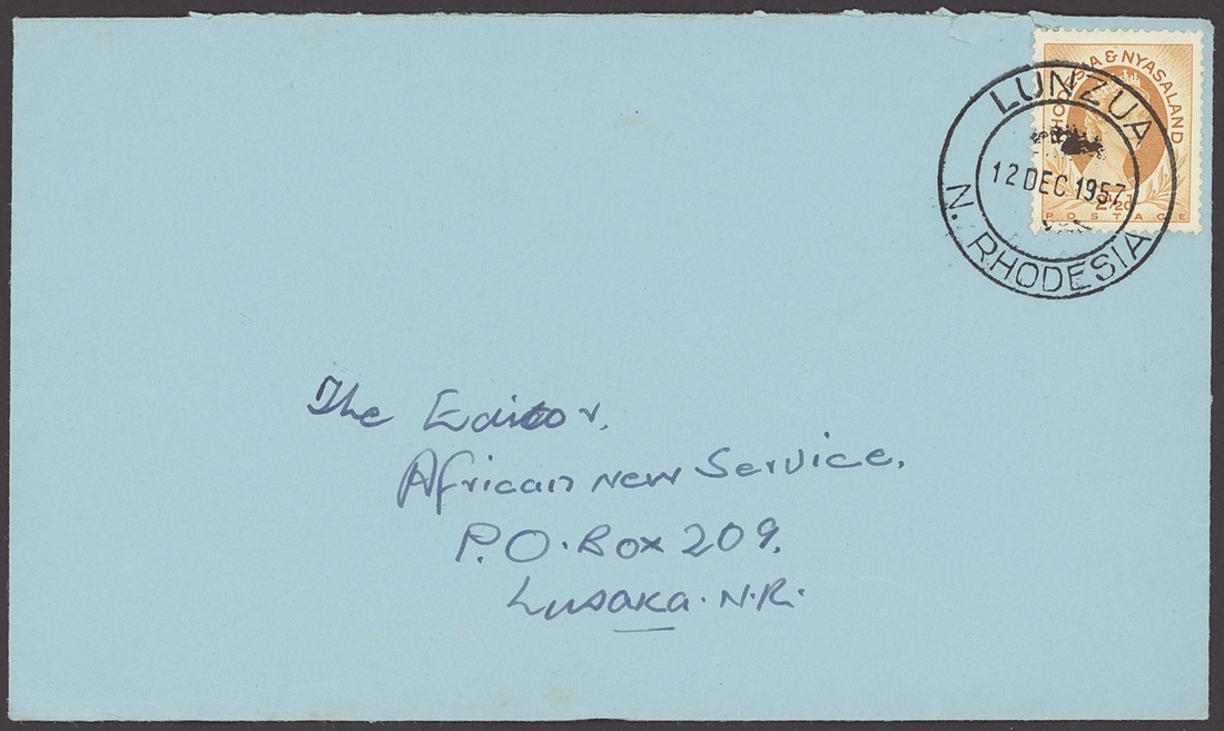 Lunzua: 1957 envelope to Lusaka bearing R&N 2½d. with a superb complete strike