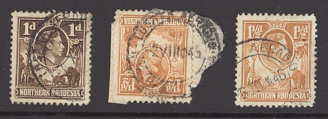 Lusaka Aeradio: 1946-47 part to large part strikes on 1938-52 1d. brown and 1½d. yellow-brown (2, one on fragment), one of the 1½d. dated 3 March 1946, the earliest date recorded in Proud; a rare trio normally only used on telegrams