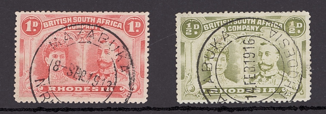 Mazabuka: Double-ring datestamps on Double Head ½d. and 1d. dated 1916 and 1913 respectively, fine large part strikes