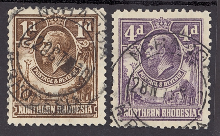 Nchanga Chingola: 1925 1d. and 4d. with large part strikes of the double-ring datestamp, that on the 1d. dated 22 October with block before last two digits of year, that on the 4d. dated 28 November though with year date unreadable. Rare
