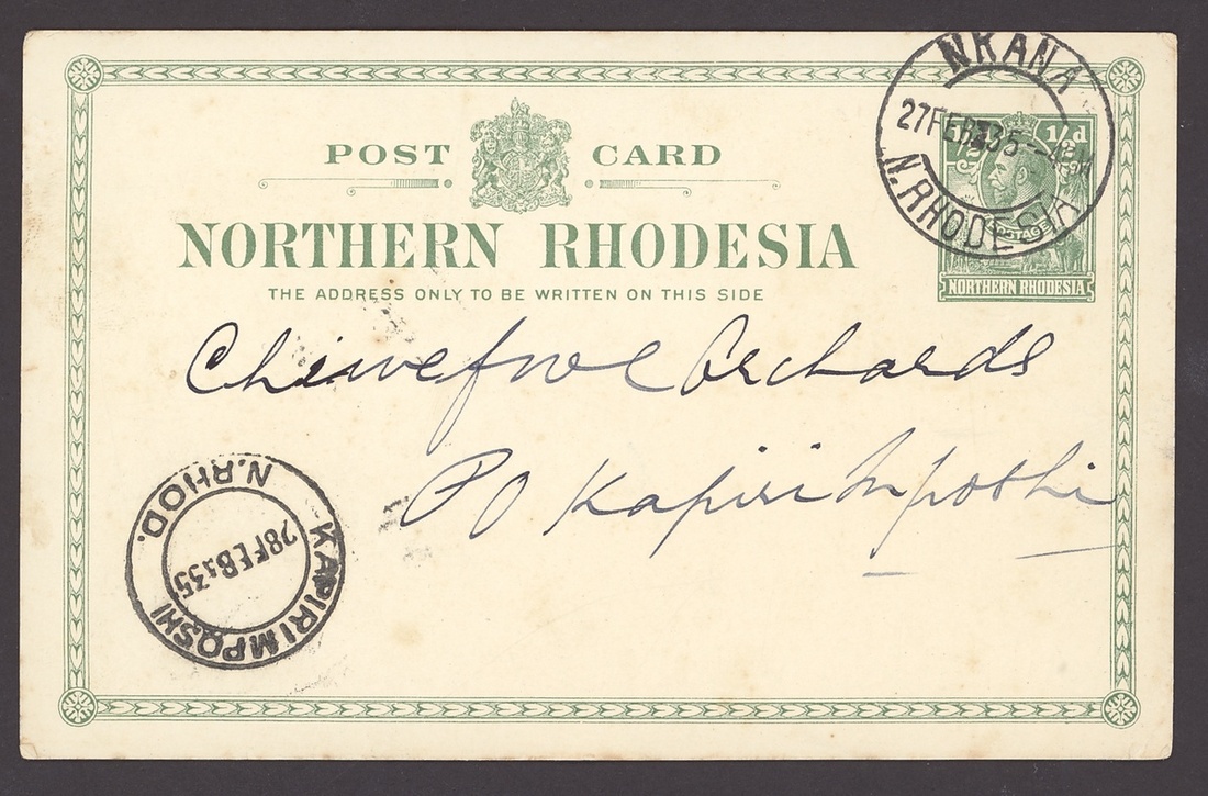 Nkana: 1935 (27 Feb.) ½d. green card to Kapiri Mposhi Post Office cancelled with a fine complete strike of the double-ring datestamp, arrival datestamp (28.2) at lower left corner