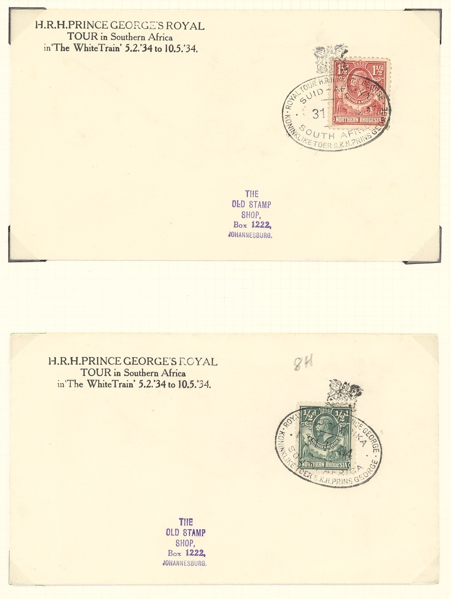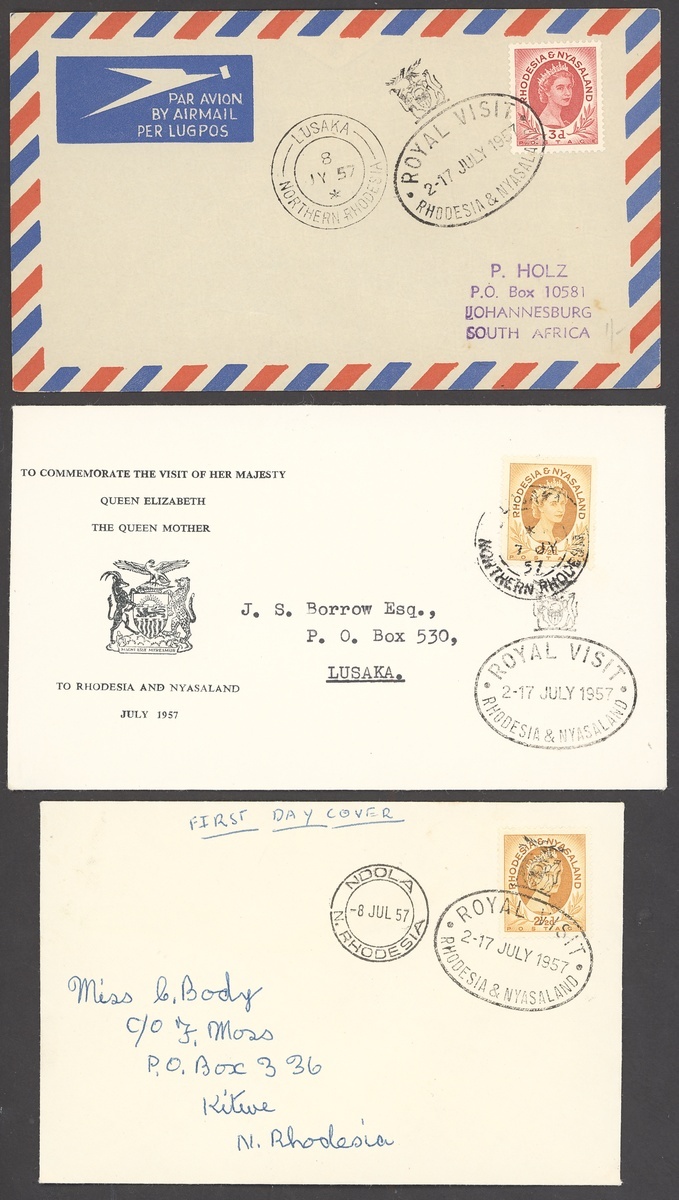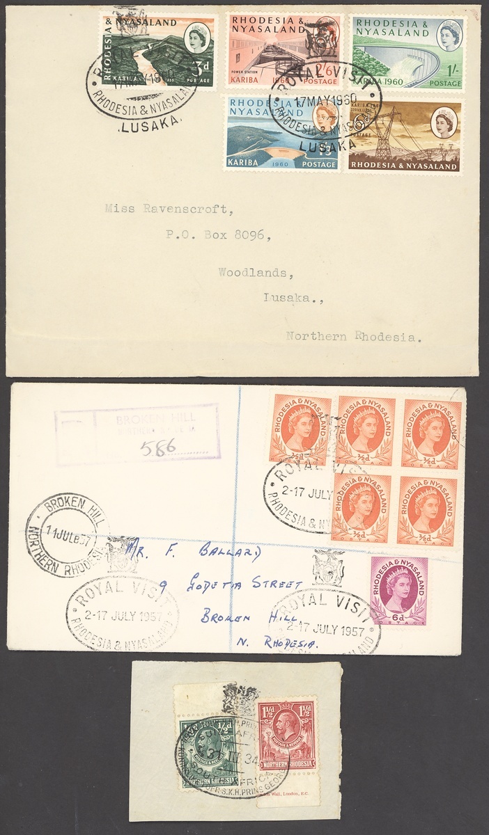 1935 Prince George's Tour envelopes (2) and a piece with oval datestamps for 31 March, 1957 Queen Mother's Tour envelopes from Broken Hill (registered), Lusaka (2) and Ndola with oval datestamps, and 1960 envelope with "