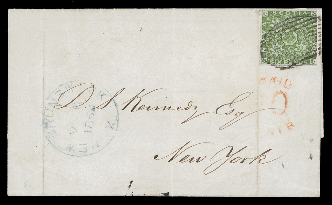1851-60 6d. yellow-green clearly tied by oval grid on 1852 entire letter to New York, showing "