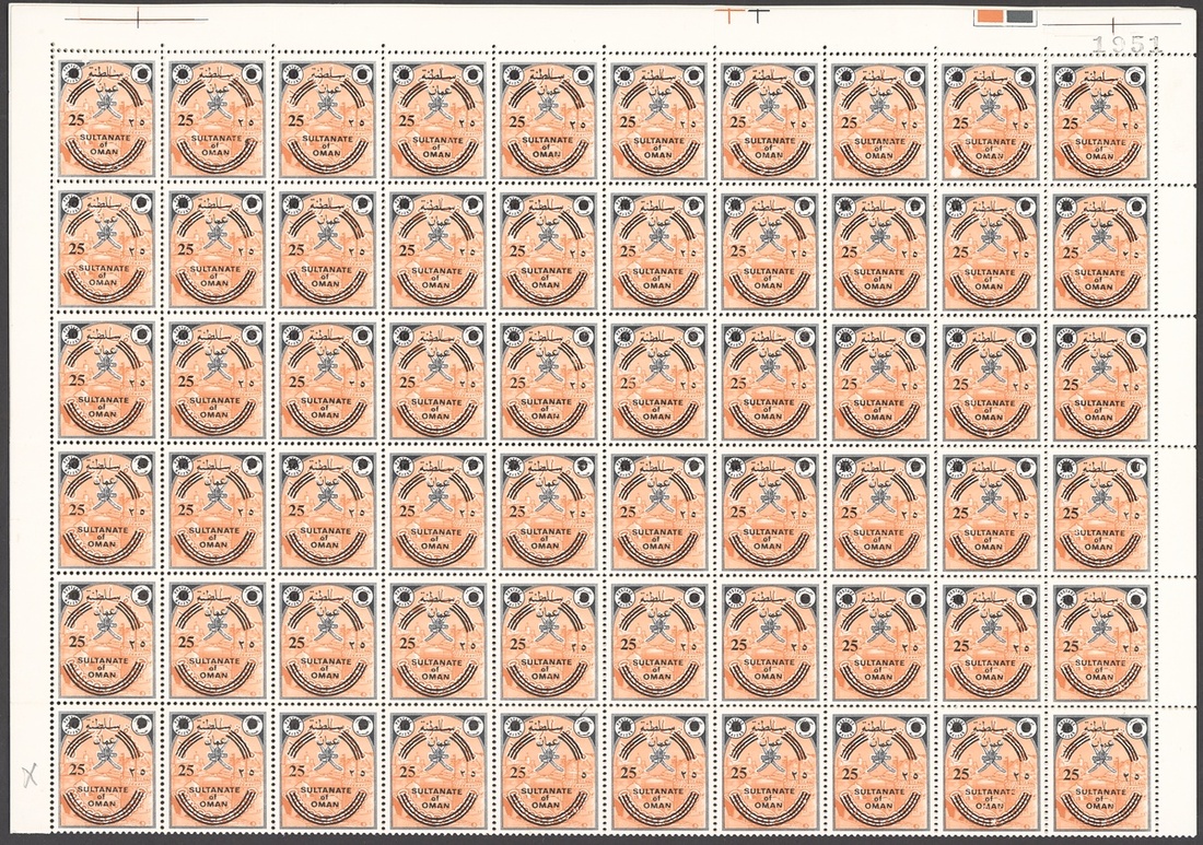 1972 25b. on 40d. black and red-orange, complete sheet of 120 (10x12), including the Arabic "2" omitted [R.6/5] and [R.10/5] and Arabic "5" omitted [R.8/5] and [R.12/5] errors, unmounted mint, folded through some perfs. and small pencil notations in the margins. A fabulous rarity. S.G. 145, 145a, 145b, £39,000+