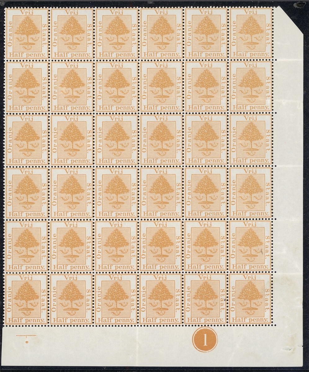 1897 ½d. orange in a lower right corner block of thirty six showing the plate number, unmounted mint. S.G. 85, £99