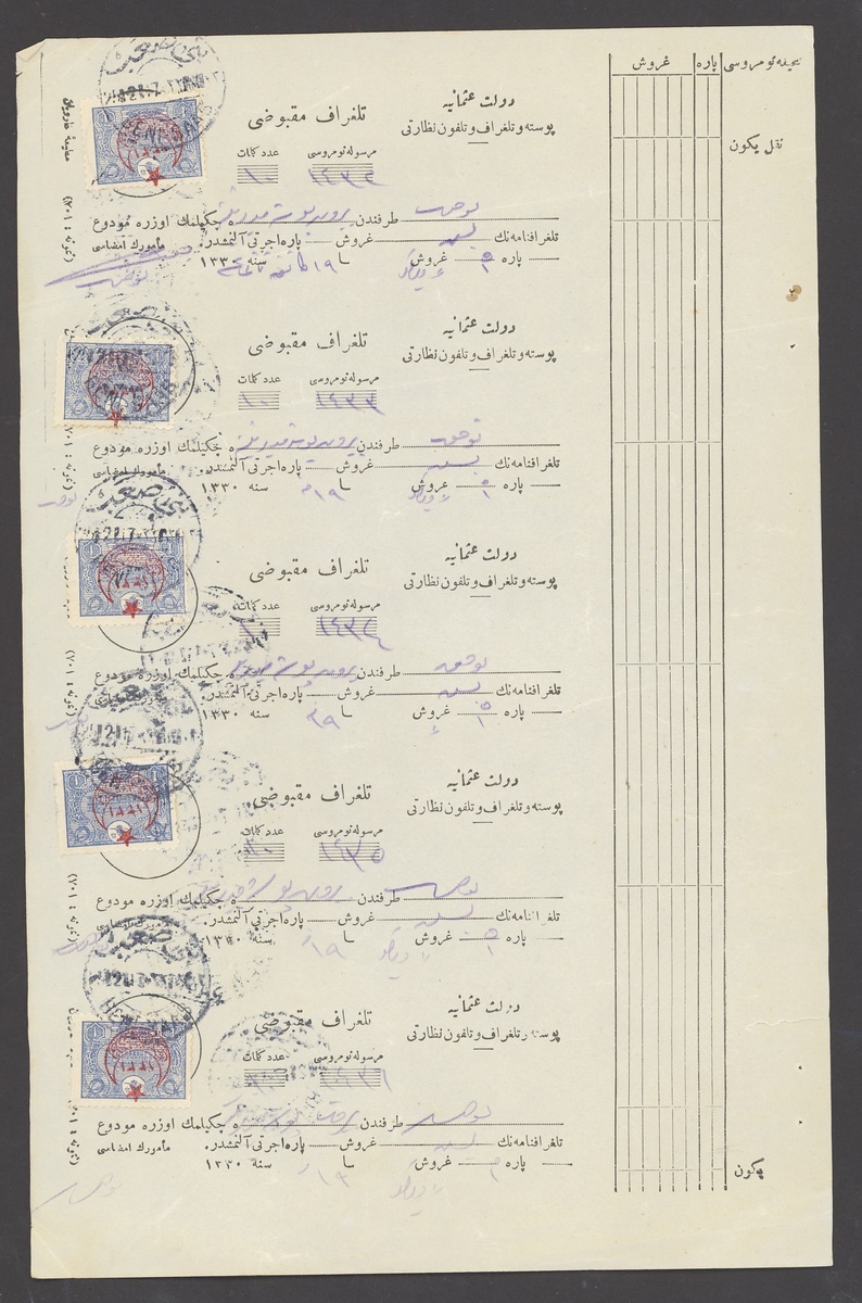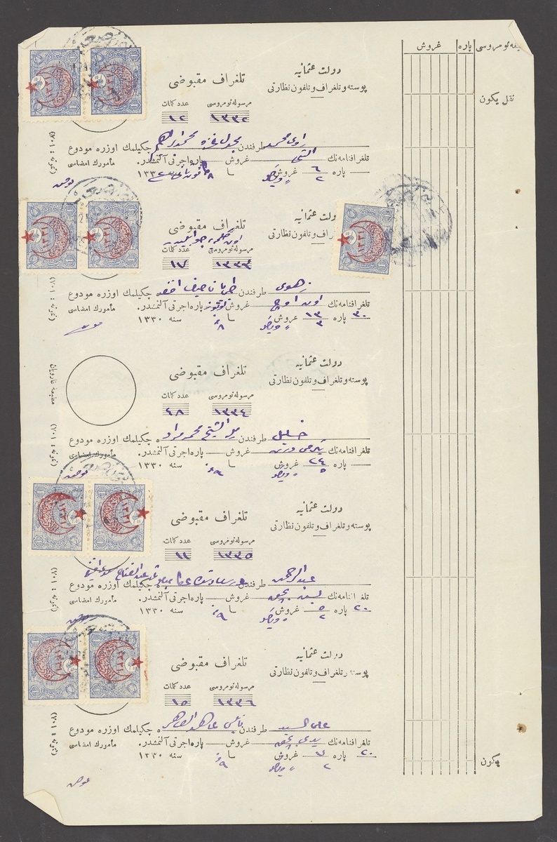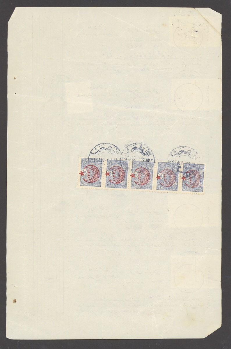 Beni-Saab: 1917, two pages from a Post Office book bearing a total of fourteen Turkey 1916 G.P.O. Constantinople 1p. ultramarine with small five pointed star overprint (S.G. 651) cancelled by ten Beni-Saab datestamps; a few minor faults