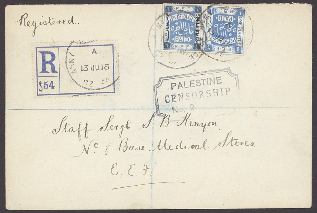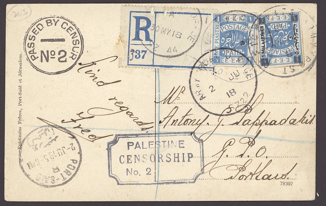 1918 (30 May) picture postcard (creased) registered from Jerusalem to Scotland, bearing 5m. on 1pi. plus 1pi. ultramarine, both tied by