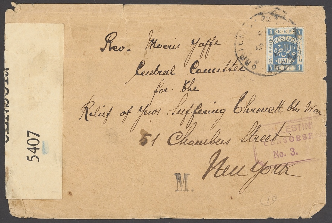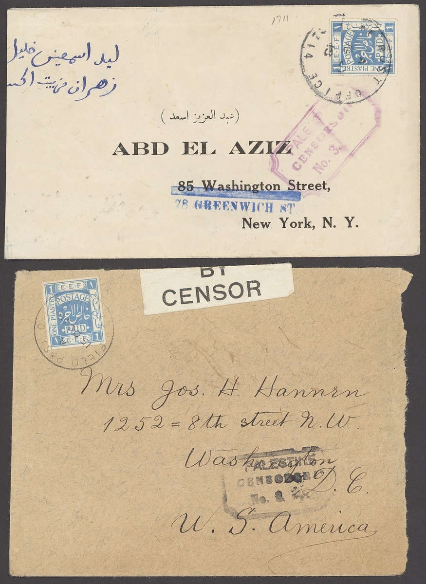 1918 (July) envelopes (2, one with peripheral faults) from Jerusalem to New York, and 1918 (15 Oct.) envelope from Haifa to Washington D.C., each bearing 1pi. blue tied by APO c.d.s., two with Censor label and all with Censor cachet. A good group