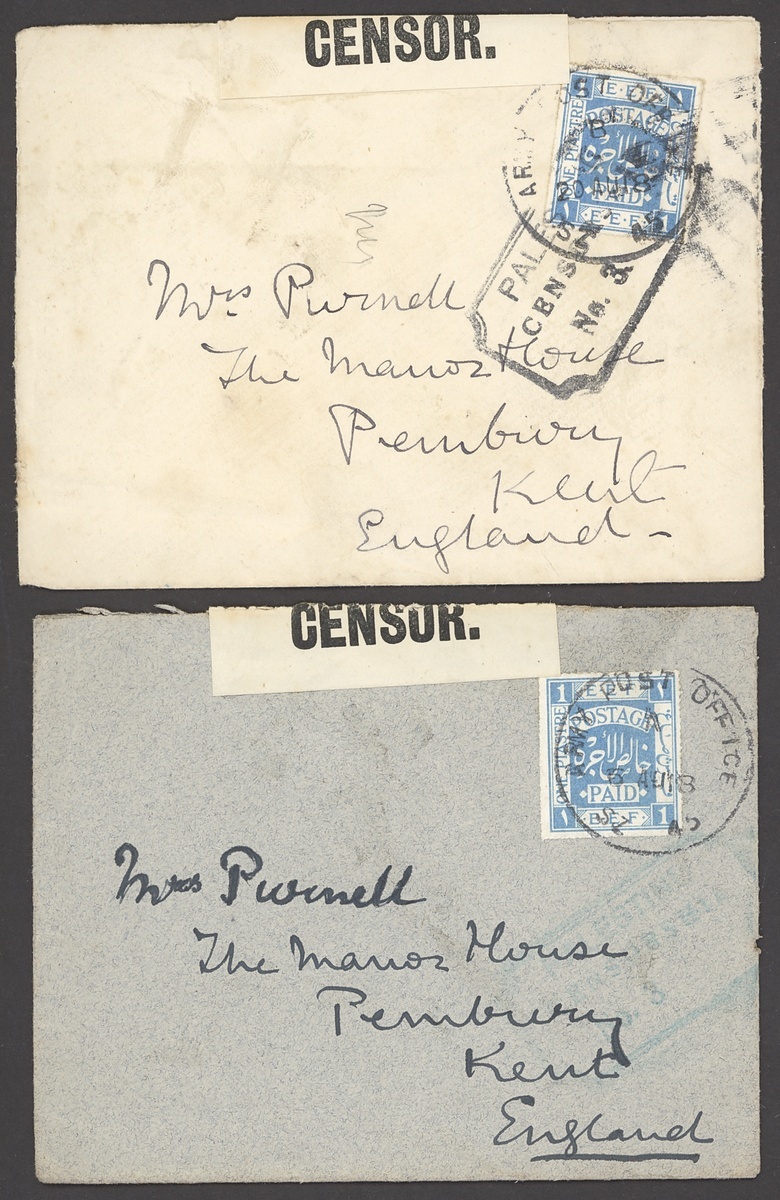 1918 (Aug.) envelopes (2) ex the same correspondence from Jaffa to England, both bearing 1pi. blue tied by
