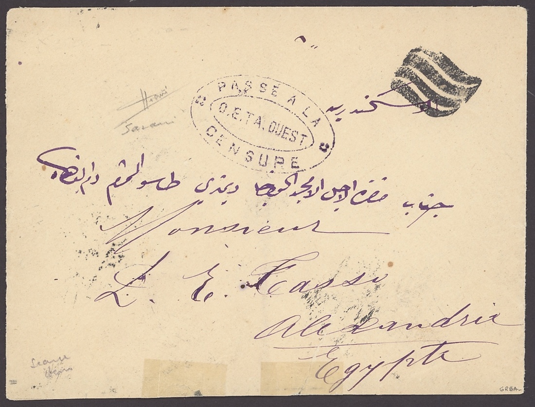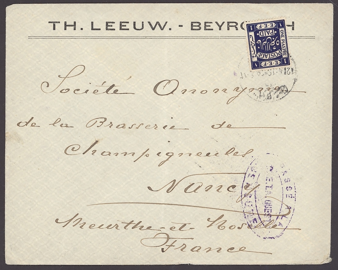 1919 (12 Feb.) envelope (opened-out; faults) from Beirut to Alexandria bearing, on reverse, 1pi. indigo tied by bi-lingual