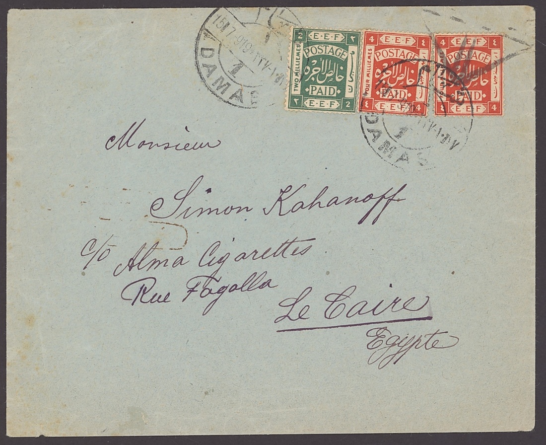 1919 (15 July) envelope from Damascus to Cairo, bearing 2m. green and 4m. scarlet (2), all tied by bi-lingual