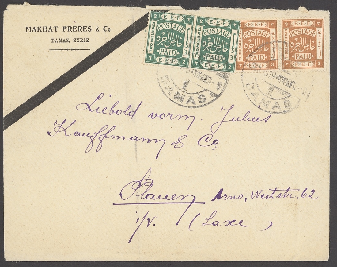1919 envelope from Damascus to Germany, bearing 2m. green and 3m. yellow-orange pairs, both clearly tied by bi-lingual