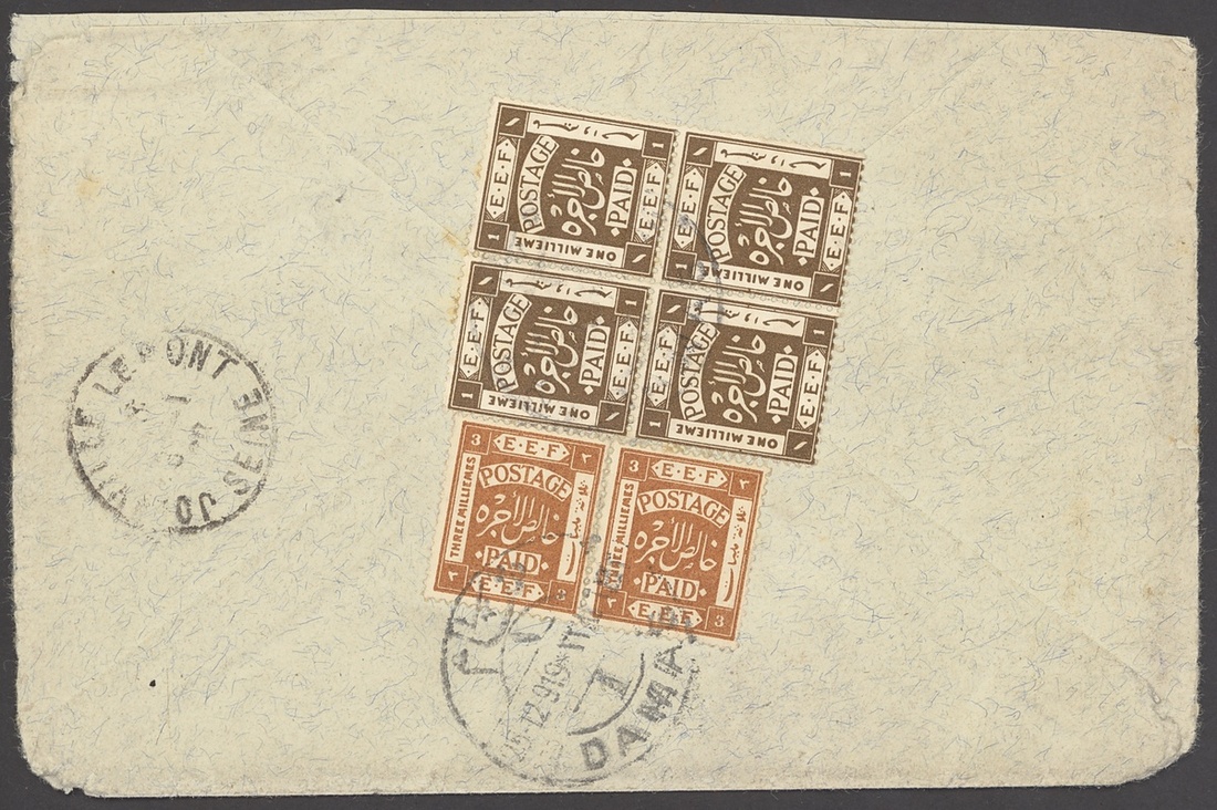 1919 (7 Dec.) envelope from Damascus to France bearing, on reverse, 1m. sepia block of eight (2x4) and a pair, all cancelled by bi-lingual