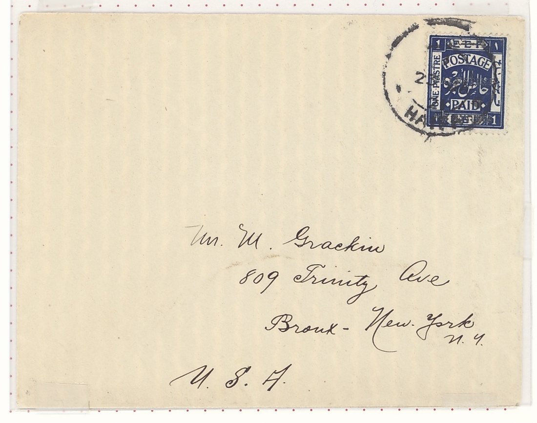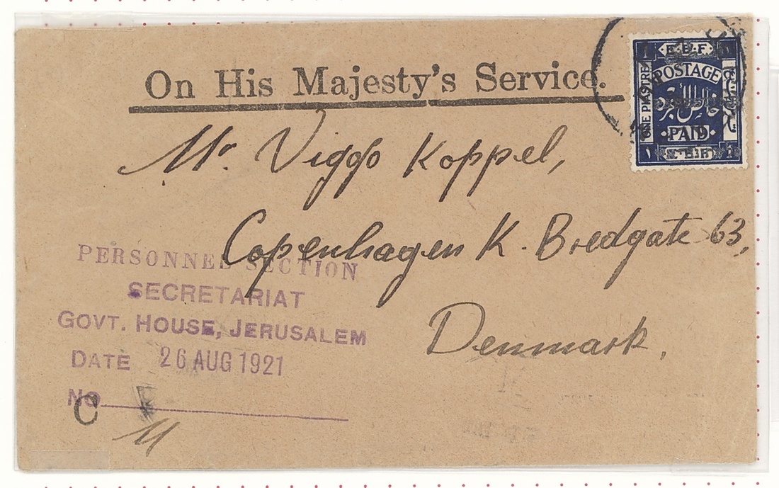 1921 (23 Aug.) envelope from Haifa to New York and 1921 (26 Aug.) OHMS envelope from Jerusalem to Denmark, both bearing Jerusalem II perf 15x14 1pi. A scarce pair