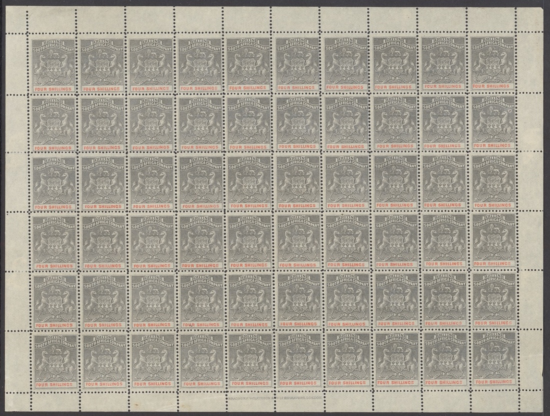 1892-94 4/- grey-black and vermilion, a sheet of sixty with full original gum, a few minor blemishes in the margins only; fine. S.G. 26, £4,500+