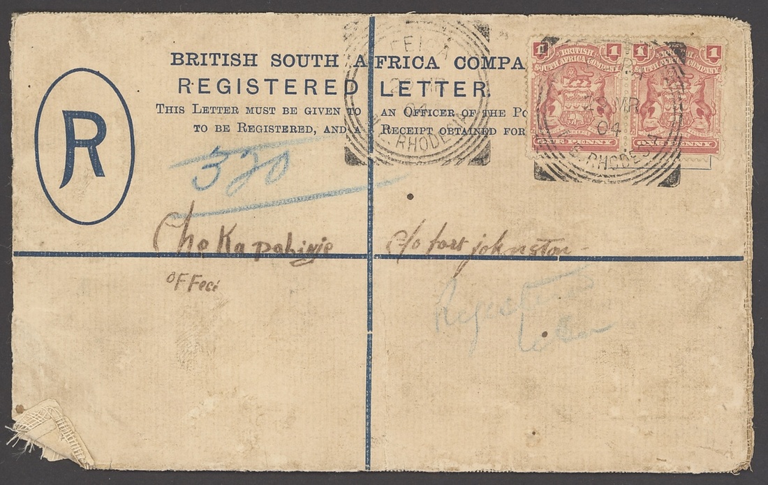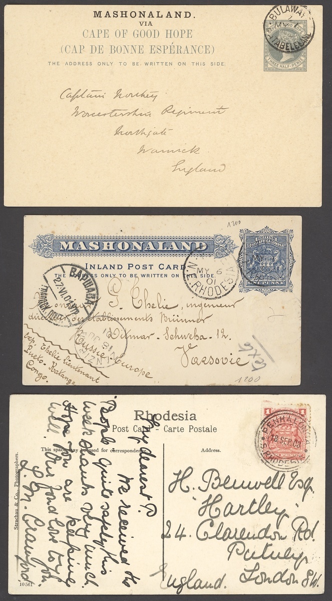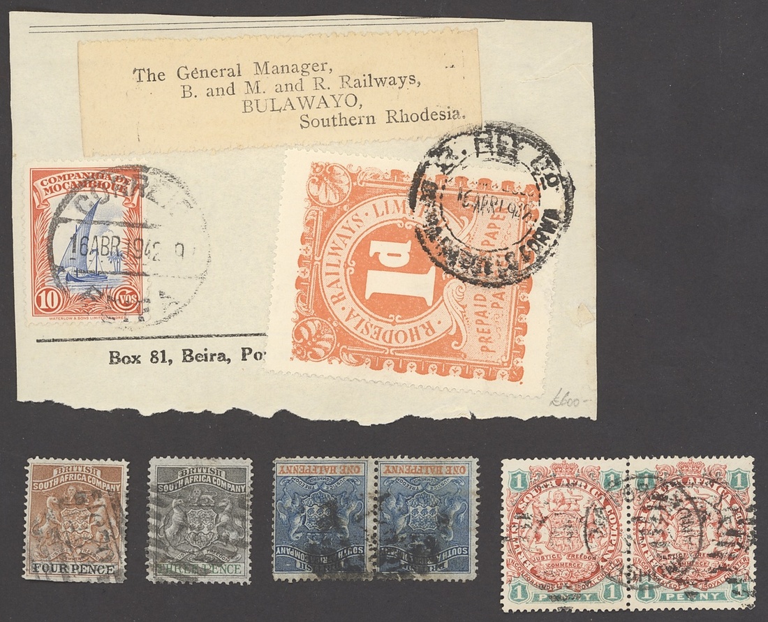 1895 1½d. card from Bulawayo to England, 1901 1d. card (additional stamp removed) from Fife to Russia, 1903 card from Penhalonga to London, 1904 4d. registered envelope (soiled), uprated with 1d. pair, from Feira via Fort Jameson to Fort Johnston, and six loose adhesives with early postmarks; also 1942 newspaper piece from Beira to Bulawayo bearing Mozambique 10c. and Rhodesia Railways 1d.