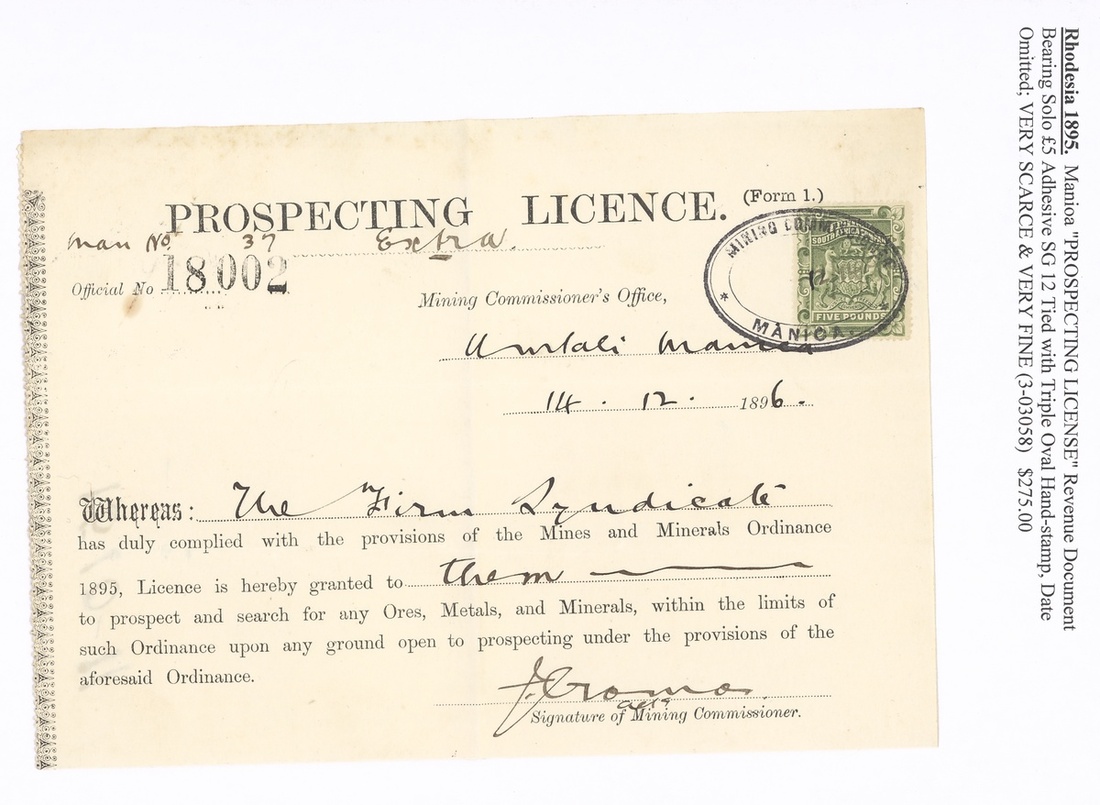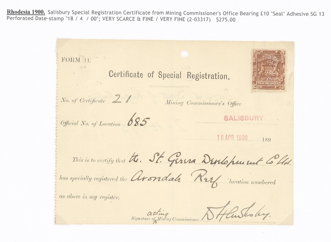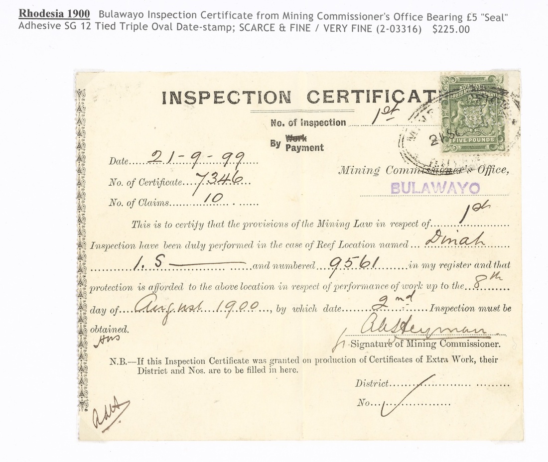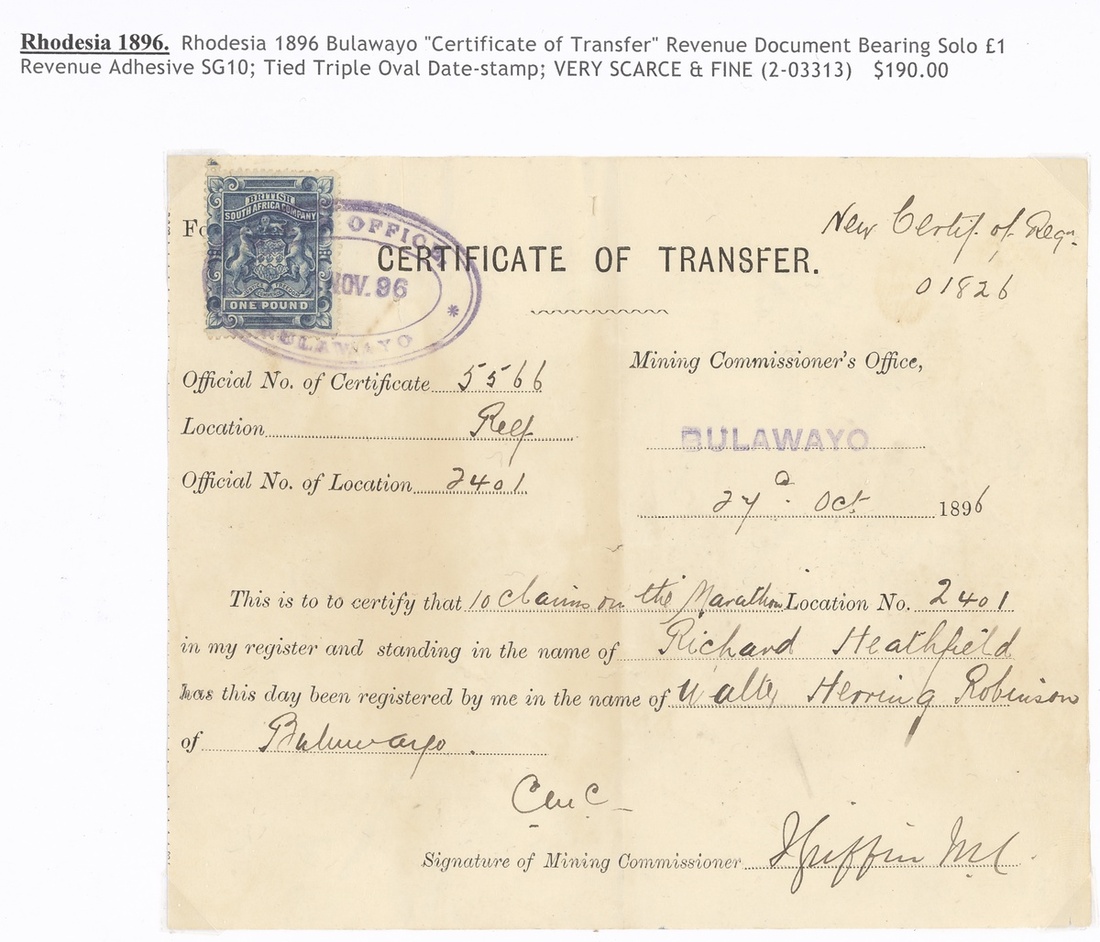 1896-1909 Mining Commissioner's Office documents, four bearing 1892 £1, £5 (2) and £10, the last with dated perfin of Salisbury, the others with oval datestamps of Bulawayo (2), Hartley (Falls 5/-) and Manioa. A fine and attractive quintet