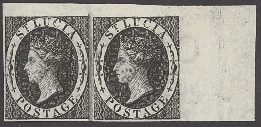 1864 (1d.) black plate proof on CC paper, horizontal pair from the upper right corner of the sheet, large part original gum. B.P.A. Certificate (1998)
