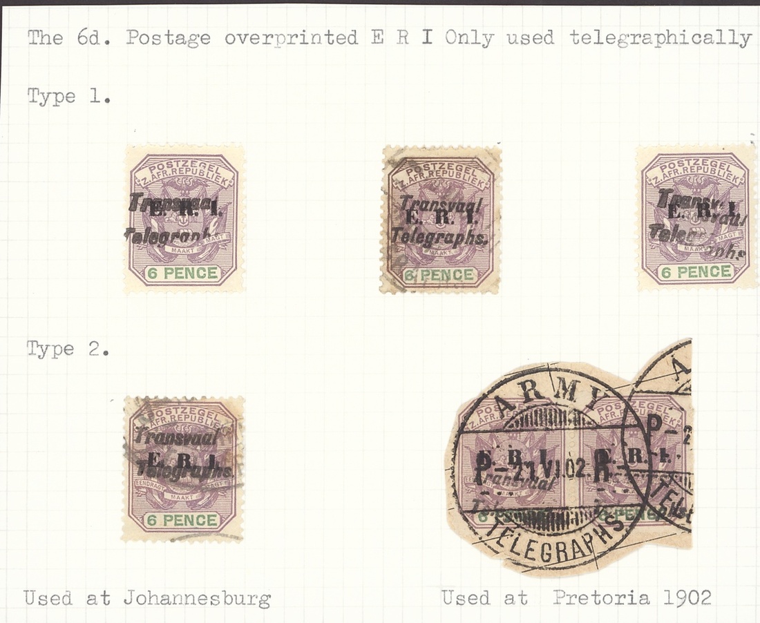 1902 (June?) handstamped in two different types on E.R.I. 6d. mint (2, one with handstamp double) and used (4 with two on the one Telegraph form piece with "