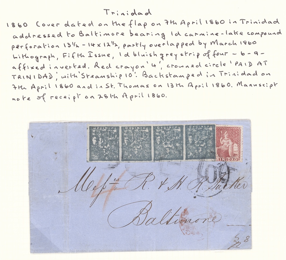 1859 (Sept.) compound pin-perf. 13½-14 x 12½ (1d.) carmine-lake with complete perforations on two sides, partly overlapped by 1860 (Mar.) Litho, fifth issue, (1d.) bluish grey strip of four [6-9] (affixed inverted),  all tied by light
